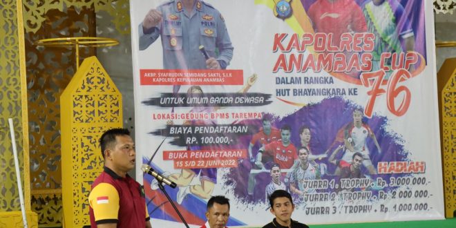 Anambas, Liputanwarta.com -Menyambut hari Bhayangkara ke 76, Polres Kepulauan Anambas menggelar turnamen Badminton Kapolres Anambas Cup I tahun 2022, di Gedung Balai Pertemuan Masyarakat Siantan (BPMS), Jumat (24/06/2022).