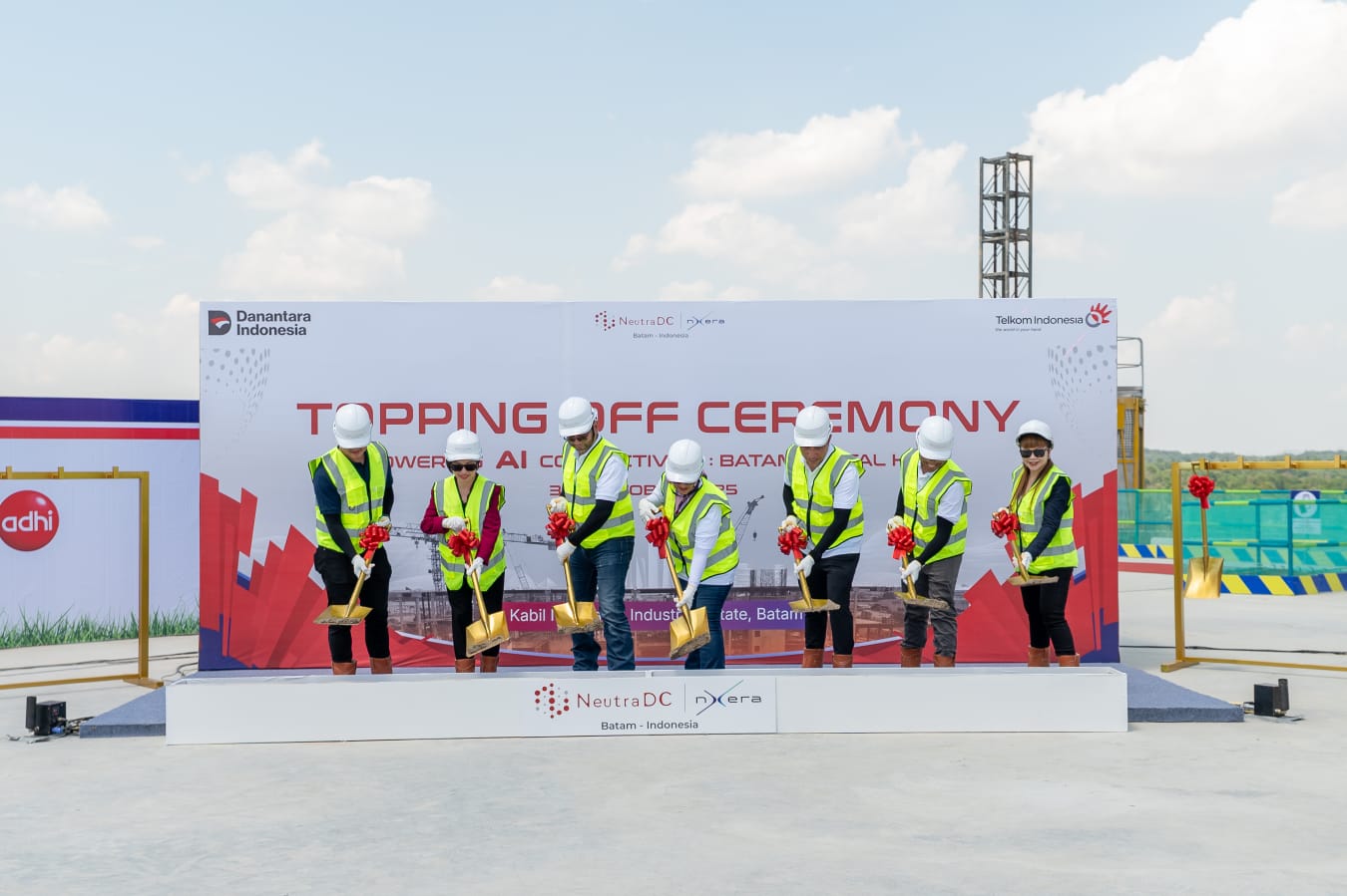 Ket Foto: (Dari kiri ke kanan) Adrianto Darmoyo, VP Renewables Of Medco Power Indonesia; Cyndi Pei, CFO Singtel Digital Infraco And Nxera; Seno Soemadji, Direktur Strategic Business Development & Portfolio Telkom Indonesia; ⁠Dian Siswarini, Direktur Utama Telkom Indonesia; Andreuw Th.A.F, CEO NeutraDC Group; Indrama YM Purba, CEO NeutraDC Nxera Batam; Gan Siok Hoon, Group Chief Corporate Officer Designate, Singtel, melakukan simbolisasi Topping Off di atap gedung campus data center (BTM-1) NeutraDC Nxera Batam | dok.ist/LWnet